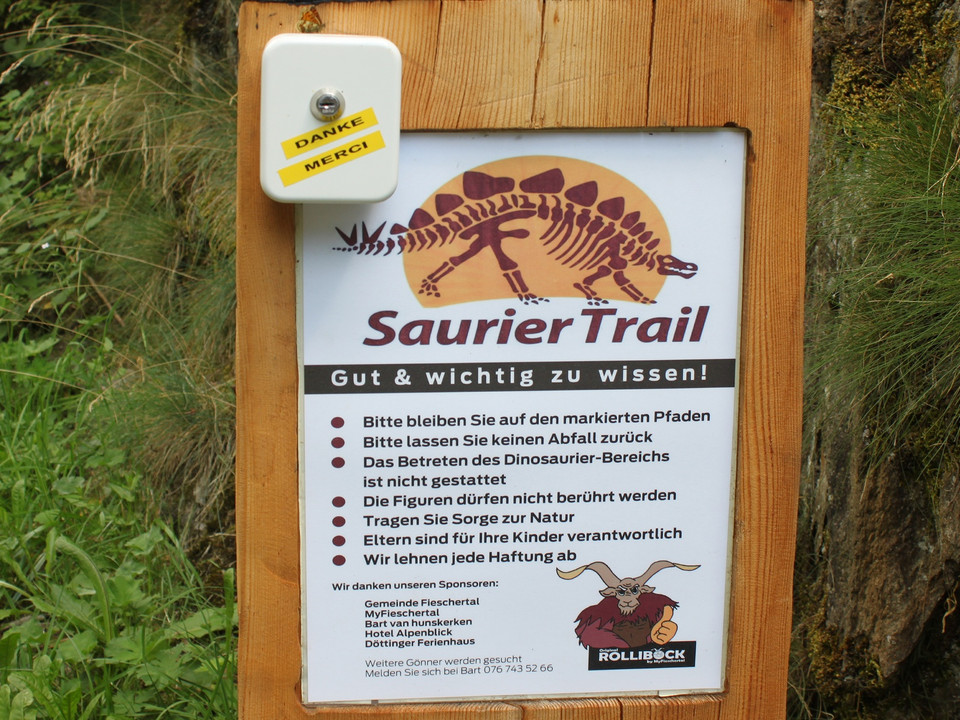 Le point de départ du parcours à thème est la place du village de Fieschertal. Le chemin traverse le quartier Lambrigge en direction du feu de camp « Schweizer Familie » dans le Brüchergand. Sur le Sauriertrail, tu rencontreras 8 dinosaures en taille réelle reproduits artisanalement en bois. Des panneaux d'information à chaque station transmettent des connaissances sur les dinosaures préhistoriques. Marche sur les traces d’Ankylosaurus, Velociraptor, Parasaurolophus, Ornithomimus, Stegosaurus, Triceratops, Pteranodon, Dimetrodon et Oviraptor. La randonnée devient un vrai plaisir pour les petits explorateurs et chercheurs.